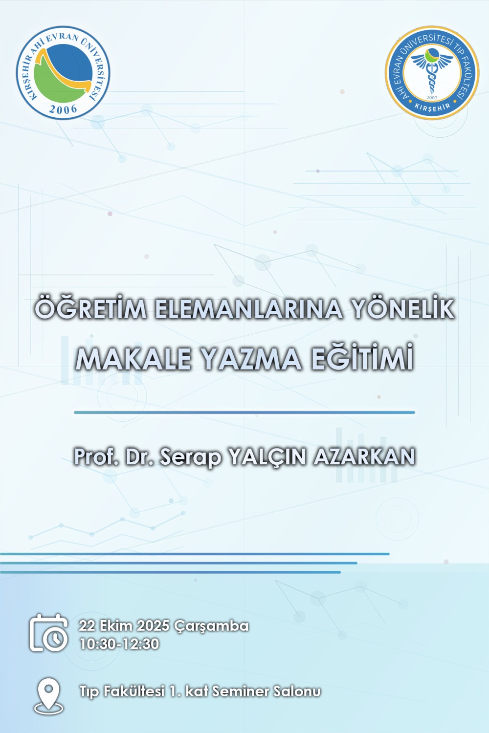 Fakültemiz Dahili Tıp Bilimleri Bölümü Farmakoloji Anabilim Dalı Öğretim Üyesi Prof. Dr. Serap YALÇIN AZARKAN tarafından Makale Yazma Eğitimi verilecektir.
