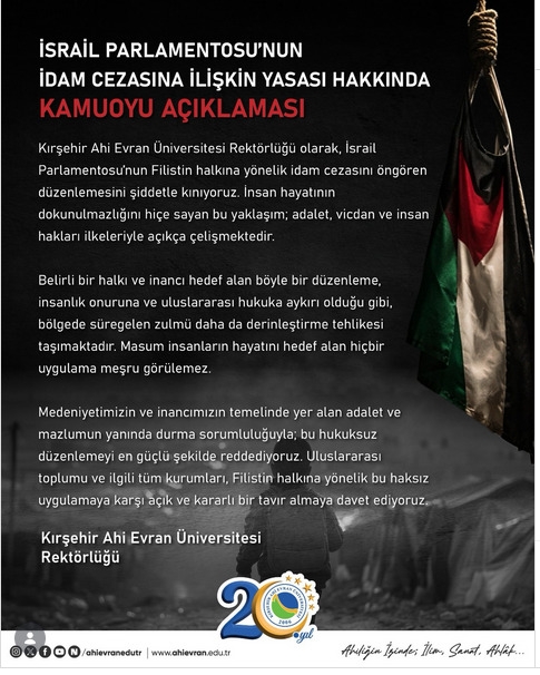 Kırşehir Ahi Evran Üniversitesi Tıp Fakültesi olarak, İsrail Parlamentosu’nun Filistin halkına yönelik idam cezası öngören düzenlemesini şiddetle kınıyoruz. İnsan hayatına saygısız bu yaklaşımın, adalet, vicdan ve insan hakları ilkeleriyle bağdaşmadığını vurguluyoruz.