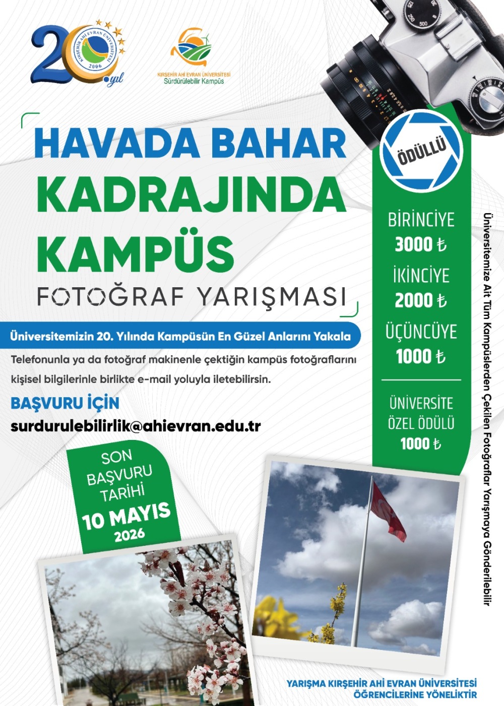 Üniversitemizin 20. yılı etkinlikleri kapsamında “Havada Bahar Kadrajında Kampüs” Fotoğraf Yarışması düzenlenmektedir. Tüm öğrencilerimizi kampüsümüzün bahar güzelliklerini kadrajlarına yansıtmaya davet ediyoruz. 📷🌸
